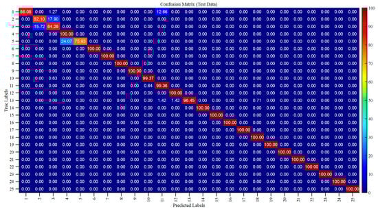 Figure 8 illustrates the confusion matrix for the PSO-SVM model. The experimental results show that the recognition rate of defects in Categories 01–03 is more than 82.1%. Among them, the outer-sheath damage defect causes the fault sheath loop current at the end of the sheath to differ from the simulation results. As the defect location increases in distance from the starting point, the phase angle and amplitude difference of the three-phase sheath voltage initially increase and then decrease. This different feature is significant. For defects of Types 16–24, the recognition rate reaches 100%.