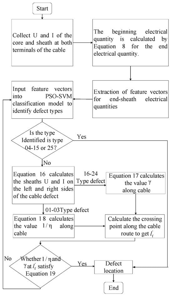 (3) Input the feature vectors into the trained PSO-SVM classification model to identify the defect types. The identified types are 04–15 and 25, which locate the fault location; the identified types are 01–03 and 16–24, which perform the locating fault step 4.