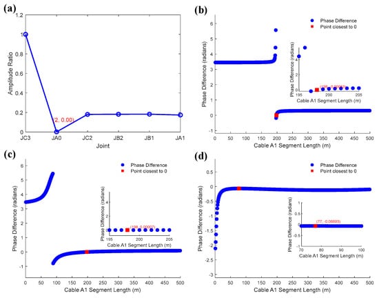 (a) Open-circuit defect localization; (b) location of defects in the outer sheath at 200 m of breakage with a transition resistance of 0.01 Ω; (c) location of defects in the outer sheath at 200 m of breakage with a transition resistance of 1 Ω; (d) location of defects in the outer sheath at 100 m of breakage with a transition resistance of 100 Ω.