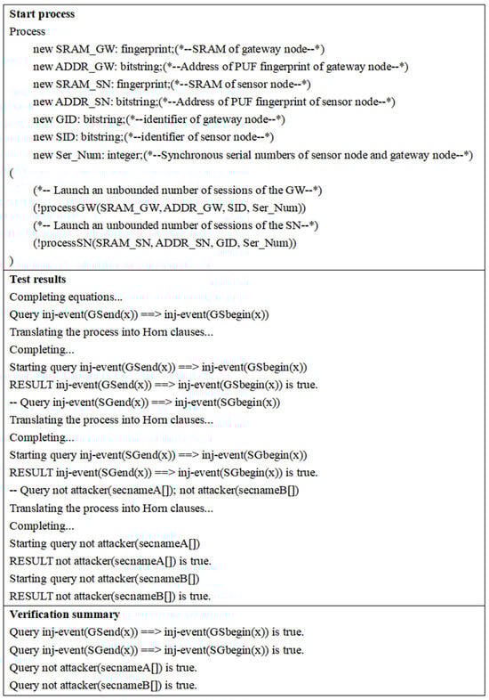 - We have demonstrated through formal verification that the scheme can achieve mutual authentication and ensure the security of the session key. The security of the protocol was verified from BAN logic and non-formal analysis. This solution has good forward confidentiality and user anonymity and can effectively defend against replay attacks, node capture attacks, node spoofing attacks, online key guessing attacks, desynchronization attacks, physical attacks, and modeling attacks.