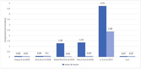 Computational costs comparison in all related schemes. The results are shown for various approaches, including Yang, Z. et al. (2020) [], Amin, R. et al. (2018) [], Ostad-Sharif et al. (2019) [], Das, A.K. et al. (2018) [], Li, X. et al. (2017) [], and our proposed method.