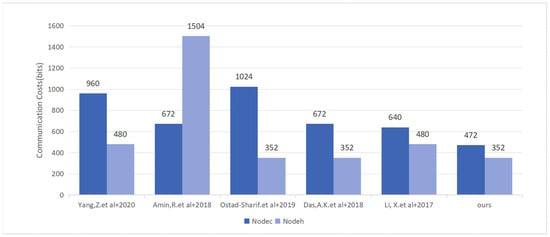 Communication costs comparison in all related schemes. The results are shown for various approaches, including Yang, Z. et al. (2020) [], Amin, R. et al. (2018) [], Ostad-Sharif et al. (2019) [], Das, A.K. et al. (2018) [], Li, X. et al. (2017) [], and our proposed method.