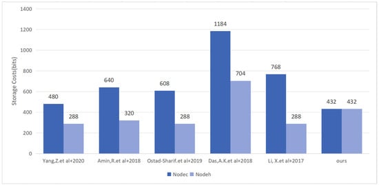 Storage costs comparison in all related schemes. The results are shown for various approaches, including Yang, Z. et al. (2020) [], Amin, R. et al. (2018) [], Ostad-Sharif et al. (2019) [], Das, A.K. et al. (2018) [], Li, X. et al. (2017) [], and our proposed method.
