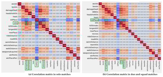 After data preprocessing, the variance inflation factor (VIF) [25] was calculated for all variables in solo, duo, and squad matches. Table 2 presents the results of this analysis. In solo matches, the “kills” variable exhibited the highest VIF value at 12.549613. However, considering that “kills” is a crucial factor in predicting the win rate in survival games, it was deemed inappropriate to remove it. Therefore, to better understand the relationships between “kills” and other variables, a correlation analysis was conducted, as illustrated in Figure 1a. Based on the results of the correlation analysis, variables with high VIF, such as “damageDealt” and “killPlace”, which showed strong relationships with the “kills” variable, were removed to address multicollinearity. In the case of duo and squad matches, the variable “killPlace” exhibited the highest VIF value of 10.331870. Following the same approach used in the correlation analysis for solo matches, both “damageDealt” and “killStreaks” variables were removed, excluding the key variable “kills”. This can be observed in the correlation matrix shown in Figure 1b.