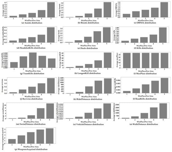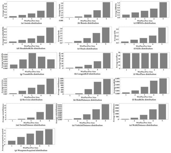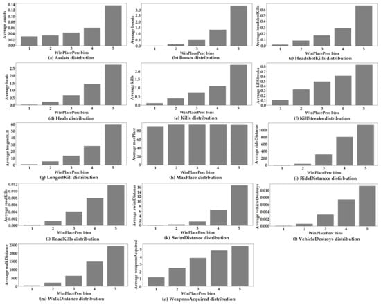 In Figure 2, “winPlacePerc” was divided into five percentile-based intervals to represent rank percentiles, and a comprehensive analysis was conducted to visualize the distribution of various game performance metrics across these intervals. It shows the distributions of various variables utilized in solo matches. Combat and survival activities, such as “assists”, “boosts”, “heals”, “kills”, and “headshotKills”, showed a significant increase in the upper percentile range (winPlacePerc = 5). Notably, in solo mode, where players cannot rely on support from teammates, the positive correlation between “assists” and high rankings was particularly intriguing. Additionally, the use of “boosts” and “heals” was found to be essential for achieving top placements, while “kills” and “headshotKills” highlighted the direct relationship between individual combat proficiency and higher ranks. Distance-related variables, including “longestKill”, “rideDistance”, and “walkDistance”, also demonstrated notable increases in the upper ranking percentiles. “longestKill”, in particular, increased substantially in the highest “winPlacePerc” bins, indicating that accurate long-distance engagements have a significant impact on securing victories. “rideDistance” showed higher averages in the mid to upper percentiles, suggesting that the strategic use of vehicles for positioning or evasion is a characteristic of top-ranked players.