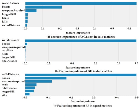 Figure 5 illustrates the feature importance [26] assigned by the top-performing models (XGBoost, GD, and RF) for each match type (solo, duo, and squad) in PUBG. This visualization highlights the variables that play a critical role in predictive accuracy for each match type. In solo matches, XGBoost indicates that “walkDistance” is the most significant variable, with an importance score exceeding 0.6, which is markedly higher than other variables. Following this, “boosts” and “weaponsAcquired” show moderate importance scores of approximately 0.2 and 0.1, respectively. Other variables, such as “longestKill”, “heals”, “kills”, and “swimDistance”, exhibit relatively low importance. For duo matches, GD reveals that “walkDistance remains the most influential variable, with an importance score close to 1, similar to its role in solo matches. “Boosts” and “weaponsAcquired” follow, with lower importance scores, while “maxPlace”, “heals”, “longestKill”, and “rideDistance” have minimal impacts. In squad matches, RF also ranks “walkDistance” as the most important feature, though its importance is slightly reduced, around 0.4, compared to solo and duo matches. “Boosts” retains substantial importance with a score above 0.3, and “weaponsAcquired” is also considered significant. Variables such as “heals”, “rideDistance”, “longestKill”, and “kills” exhibit moderate levels of importance. Overall, “walkDistance” emerges as the most critical feature across all match types, indicating that player movement distance has a significant impact on match outcomes. Additionally, “boosts” and “weaponsAcquired” are consistently important across all match types, suggesting that resource utilization and weapon acquisition play crucial roles in player performance.