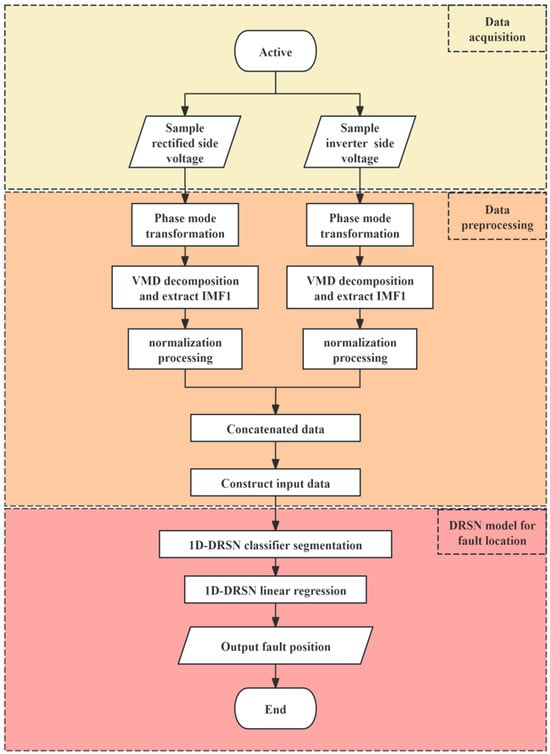 When a fault occurs on an HVDC transmission line, it generates voltage and current fault traveling waves. These fault traveling waves undergo reflections at points of impedance change, namely at both ends of the line and at the fault location. Therefore, the high-frequency components of the fault traveling waves contain rich positional information []. The general double-ended fault location scheme for HVDC transmission systems is typically based on the traveling wave method. When a fault occurs, the transient traveling wave signals generated by the fault are captured at both ends of the transmission line and analyzed to extract information such as the arrival time, polarity, and amplitude of the traveling waves. By utilizing the time difference in the traveling wave arrivals at both ends, combined with the line parameters and the propagation velocity of the traveling waves, the specific location of the fault point is calculated using a double-ended traveling wave location algorithm []. This article adopts a different approach: it collects voltage waveforms from the rectifier and inverter sides. After decoupling through phase-mode decomposition, VMD extracts the high-frequency components of the fault traveling waves. Subsequently, the high-frequency components of the voltage quantities from both ends are concatenated to construct input data, which serves as the input for the training and testing of the DRSN. Finally, the trained DRSN model is used for segmented classification, followed by regression in each segment to output the fault location results. The primary process is illustrated in Figure 1.