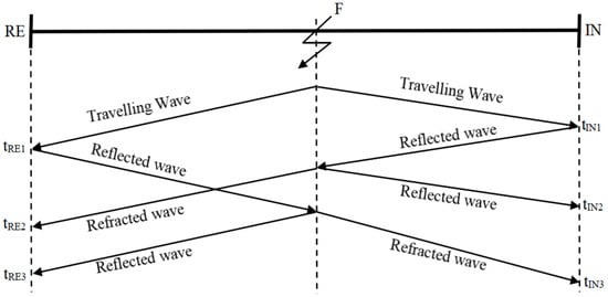 The schematic diagram of double-ended traveling waves is shown in Figure 2. After a fault occurs, the fault traveling waves generated at fault point F undergo reflections between the two measurement points RE and IN and the fault point. At moments such as tRE1, tRE2, tIN1, and tIN2, the measurement points RE and IN will receive traveling wave mutation signals. When the wavefronts of the reflected and refracted waves reach the measurement points, the measurement devices can capture the mutation signals of electrical quantities. The superimposed data of the fault traveling waves is collected upon detecting these mutation signals.