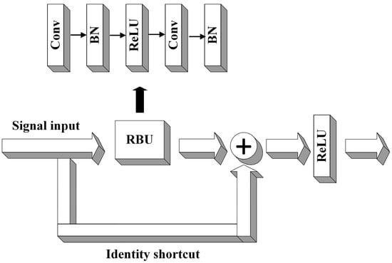 The main component of the deep ResNet [] is the Residual Building Unit (RBU). The RBU primarily consists of Batch Normalization (BN), Rectifier Linear Unit (ReLU), Convolutional (Conv) layer, and identity shortcut. The identity shortcut is a crucial improvement in deep ResNet, effectively addressing the problem of network degradation, preserving the integrity of feature information, and enhancing training efficiency and model generalization ability. The structure of the RBU is shown in Figure 3.