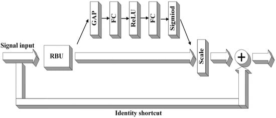 In Figure 5, the RSB module simplifies the feature maps into one-dimensional data using absolute value transformation and a Global Average Pooling (GAP) layer, which is then passed to a two-layer Fully Connected (FC) network. The second FC layer contains multiple neurons, with the number of neurons equal to the number of channels in the input feature maps. The output of the FC layer network is scaled to the range of (0,1), which the following equation can represent []: