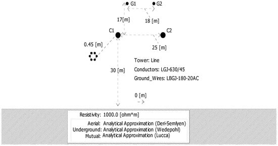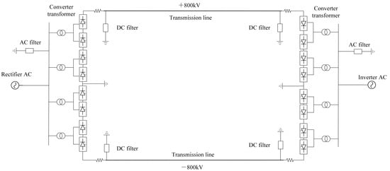 PSCAD/EMTDC is a widely used electromagnetic transient simulation software in the field of power systems. It is a powerful tool for analyzing and studying issues such as DC transmission systems and the interaction between Alternating Current (AC) and DC systems. The version of PSCAD/EMTDC adopted in this article is 4.6.2. In this article, the PSCAD/EMTDC software is used to build a ±800 kV bipolar HVDC transmission system, as shown in Figure 6. The HVDC transmission system adopts a 12-pulse converter valve, and both the rated capacity of the rectifier station and the inverter station are set to 2000 MW. The control system of the rectifier station utilizes constant current control and minimum triggering angle control, while the inverter station employs constant extinguishing angle control and constant current control. The inductance of the flat wave reactor is set to 0.4 H. The total length of the transmission line is 1000 km, and the geometric distribution of the line is shown in Figure 7. The detailed parameters of the line are presented in Table 2.