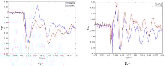Instantaneous waveform diagrams of double-ended voltage during high-resistance grounding faults at different fault poles: (a) positive pole fault; (b) negative pole fault.