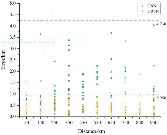 The ‘Distance’ value is obtained for each fault point by averaging the location results of 12 different fault pole types and different transition resistances in the testing data. The ‘Error’ value is then calculated as the average of the absolute values of the localization error results from these 12 different fault pole types and different transition resistances. The results are presented in Table 3. The error distribution of the measurement results for each fault point using the 1D-CNN-based fault location method and the 1D-DRSN-based fault location method is shown in Figure 10.