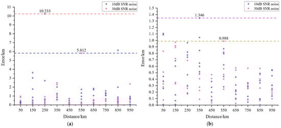 In practical HVDC transmission engineering, signals recorded by fault recorders are often contaminated by noise originating from inherent equipment noise and electromagnetic interference within the converter station valve hall environment. To evaluate the robustness of the proposed method under noisy conditions, Gaussian noise with Signal-to-Noise Ratios (SNRs) of 30 dB and 10 dB were deliberately introduced into the original fault signals. This noise level falls within a reasonable range for assessing the anti-interference capabilities of fault location methods. Subsequently, fault location was performed using both the fault location method based on 1D-CNN and the fault location method based on 1D-DRSN. For each fault location scenario, six distinct transition resistance points were selected from the testing data to generate noisy testing data for the purpose of fault location analysis. The positioning outcomes of the 1D-CNN-based method under Gaussian noise conditions with SNR of 30 dB and 10 dB are illustrated in Figure 11a, whereas the positioning outcomes of the 1D-DRSN-based method are presented in Figure 11b.