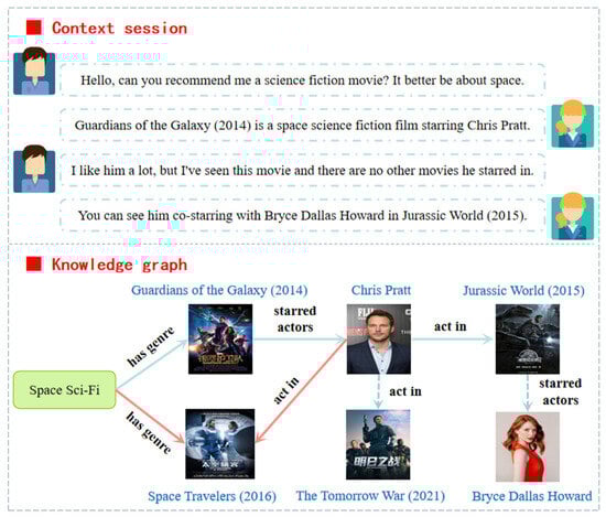 5]). In the recommendation system phase, the system learns a dialogue strategy and decides whether to ask questions about the properties of the item or to recommend the item. This decision is based on the outcome and the conversation history. The goal of the action phase is to dynamically adapt the conversation to better understand user needs and to ask questions or provide recommendations when appropriate. These works improve the performance of the dialogue recommendation system to some extent, but there are limitations. First, existing studies have only modeled the current conversation, and to provide recommended items in a short time, the rounds need to be controlled within a certain range. This restriction on the depth of interaction leads to the system’s one-sided understanding of users, and it is difficult to dig deep into users’ interests and preferences for candidates. Secondly, users’ preferences are extensive and multifaceted, whereas a single dialogue only reflects one aspect of users’ preferences, which leads to the trend of homogenization of recommendation results, which can easily cause bad phenomena such as an “information cocoon room”. An example of a movie recommendation obtained by ignoring user history information is shown in
