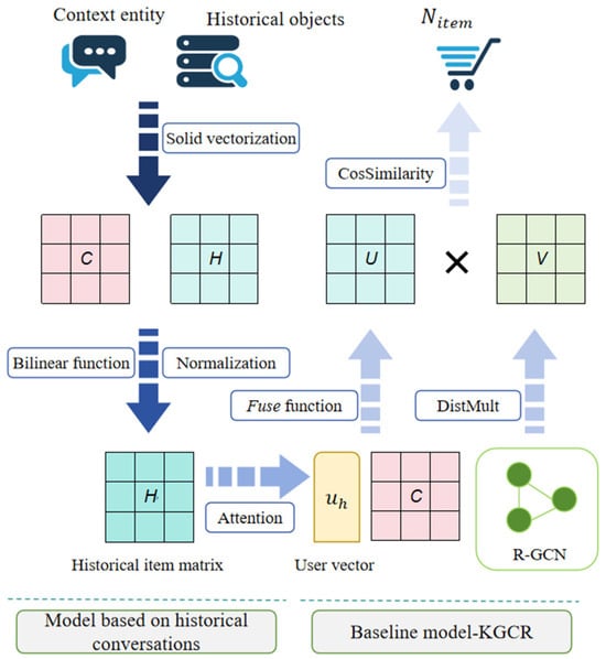 To effectively complete the personalized dialogue recommendation task, this paper proposes a new algorithmic framework—KGCR (knowledge graph-based user preference conversational recommender). A core innovation of the framework is that it is the integration of users’ historical dialogue data as contextual information into the user modeling process. In this way, KGCR can gain a more comprehensive understanding of user interests and preferences.
