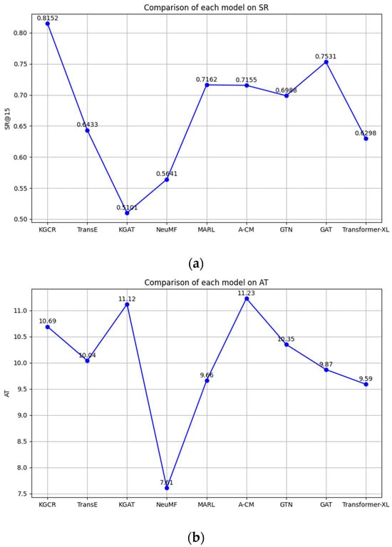 Figure 6 visually depict the differences between the KGCR model and each of the baseline models. It can be seen that the KGCR model outperforms the other baseline models on the ReDial dataset and achieves better results on both the recommendation and dialogue tasks. For the recommended task, the Hit@50 value for the KGCR model was 0.4351, which is much higher than 0.3461 for TransE, 0.3754 for KGAT, and 0.2944 for NeuMF. This indicates that the KGCR model can more accurately recommend the items that the user may be interested in. The KGCR model has an MRR@50 value of 0.0871, which is also higher than the other baseline models. This shows that the KGCR model can more effectively rank the items most interesting to users at the top of the recommended list. The KGCR model has an NDCG@50 value of 0.1945, which is also higher than the other baseline models. This shows that the KGCR model can assign the ranking weight of items more reasonably and make the recommendation results more consistent with the user’s preferences. For the dialogue task, the SR@15 value of the KGCR model is 0.8152, which is much higher than 0.6433 for TransE, 0.5101 for KGAT, and 0.5641 for NeuMF. This suggests that the KGCR model is more efficient for generating responses related to user input. The AT value of the KGCR model was 10.69, which is slightly lower than the TransE value of 10.04 but higher than KGAT and NeuMF. This shows that the dialogue text generated by the KGCR model is more smooth and natural. The experimental results of the KGCR model on the ReDial dataset show that it can effectively combine user history conversation data and knowledge graph information to provide a more comprehensive understanding of user preferences and provide more accurate and personalized recommendation results. At the same time, the KGCR model can also generate a smoother and more natural dialogue text to improve the user experience.