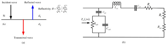 In designing OCAs on silicon substrates, a primary challenge is the downward radiation caused by the high dielectric constant of the silicon substrate, which, combined with low resistivity, results in significant absorption of radiation energy within the substrate. As illustrated in Figure 1a, from an optical perspective, the rays emitted by the antenna and incident upon the interface between different media are refracted according to Fresnel’s laws. For a silicon substrate with a high dielectric constant (εr = 11.9) and air with a low dielectric constant (εr = 1), approximately 70% of the electromagnetic wave is reflected. This phenomenon is analogous to a severe impedance mismatch in a circuit. To enhance understanding and design of the OCA, an equivalent circuit model is employed to simulate its electromagnetic characteristics and to analyze the relationship between antenna efficiency and substrate characteristics. Equivalent circuit models simplify the antenna’s radiation and loss effects into a combination of fundamental components, such as resistance, inductance, and capacitance, thereby making the analysis of antenna performance more intuitive. The equivalent circuit model typically includes parameters such as radiation resistance, surface wave impedance, and parasitic capacitance, which directly influence the radiation efficiency and impedance-matching of the antenna.