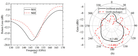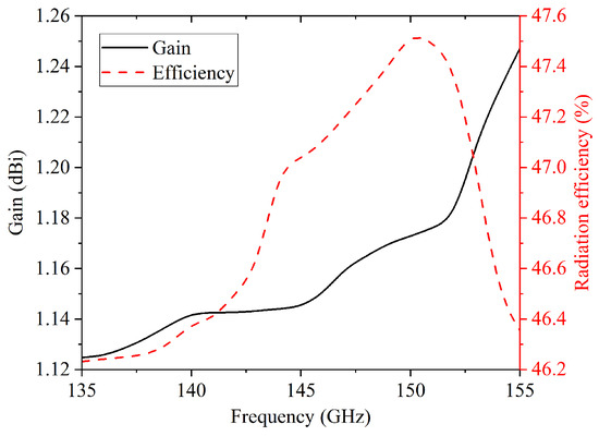 As shown in Figure 3, the bowtie OCA was simulated using ANSYS HFSS. The simulation results highlight the return loss and radiation pattern of the antenna. The S11 parameter is significantly below −10 dB across a bandwidth of 135–155 GHz, indicating a good impedance bandwidth. The peak gain recorded is −1.4 dBi at 140 GHz. Compared to pure OCA, the substrate coupling method increases the gain by 4.8 dBi. Although this gain is relatively low compared with conventional antennas, this value is typical due to its compact size and the constraints of the integration environment. The radiation efficiency of the OCA is approximately 32%. This efficiency level, while moderate, reflects the inherent challenges in designing high-efficiency OCAs, particularly due to substrate losses.