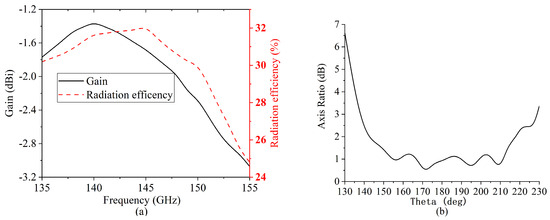 Radiation and polarization of the antenna at 145 GHz. (a) Gain and radiation efficiency of the OCA. (b) Axial ratio.