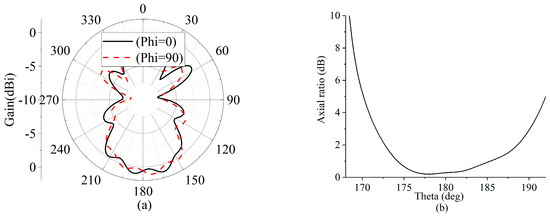 As shown in Figure 4, the simulation results for the OCA provide detailed insights into its radiation characteristics and polarization properties. Such characteristics indicate the antenna’s capability to maintain stable radiation and circular polarization, which are essential for robust wireless communication. This indicates that the carrier layer within the chip package effectively enhances the antennas’ downward radiation efficiency. While silicon lenses are a well-established method for enhancing OCA radiation, they increase costs and assembly complexity. In contrast, the integrated design approach adopted here, which leverages intrinsic package features to enhance performance, offers a potentially more cost-effective and less complex alternative. Meanwhile, for chip-phased arrays, loading silicon lens is not applicable.