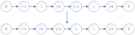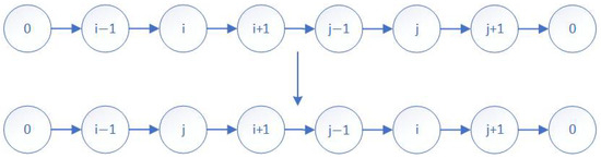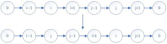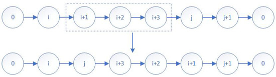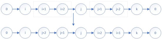 Randomly select three nodes i, j, and k from a route, reverse the two chromosome segments formed between these nodes, and then swap them to create a new route. An example of this operation is illustrated in Figure 4.