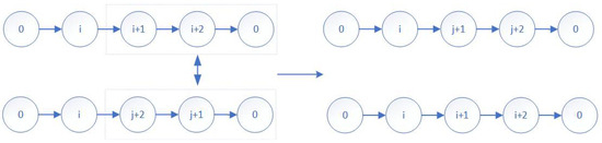 Randomly select a node i from a route, extract a chromosome segment of length three starting from this node, and reinsert this segment into any position within the remaining chromosome sequence of the same route. An example of this operation is illustrated in Figure 5.
