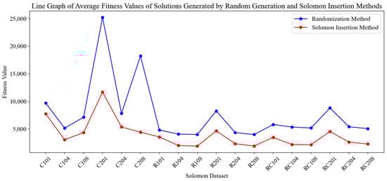 This study selected several groups from the Solomon dataset to generate the corresponding initial populations and calculate the fitness values of everyone within the initial population, along with their average values. As illustrated in Figure 8, the average fitness value of individuals generated by the Solomon insertion method is significantly lower than that of individuals generated randomly. This indicates that the Solomon insertion method produces superior individuals, enhancing the quality of solutions in the initial population of the genetic algorithm and accelerating its convergence rate.
