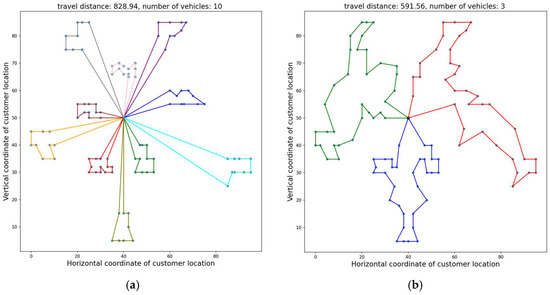 Furthermore, to ensure the robustness and reliability of the algorithm, each test instance was executed independently 20 times, and the best solution obtained was selected to evaluate the performance of the IGA-ACO algorithm. This rigorous experimental approach yields more objective and reliable results that are closer to the optimal solution, thereby enhancing the credibility of the research findings. Figure 9 illustrates the coordinate locations of the task points, the total vehicle distance traveled, and the number of vehicles used for selected instances from the Solomon dataset. The routes traveled by different vehicles are represented by folds in different colors.