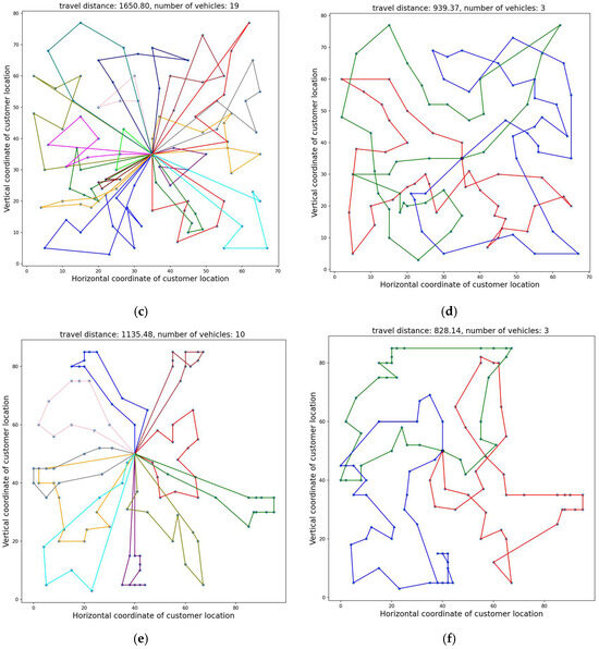 The optimal vehicle route maps some instances of the IGA-ACO algorithm. (a) C101 Solution. (b). C201 Solution. (c) R101 Solution. (d) R210 Solution. (e) RC104 Solution. (f) RC208 Solution.