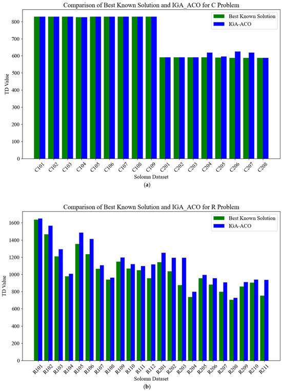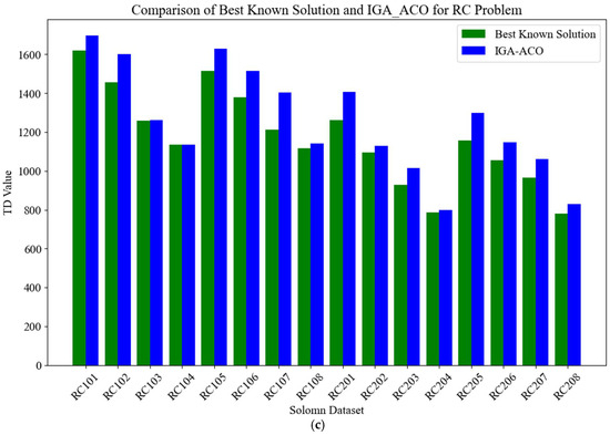 In analyzing the results presented in Table 4 and Figure 10 for the Solomon problems, where the customer distribution is relatively concentrated, the performance of the IGA-ACO algorithm is generally superior. The IGA-ACO algorithm demonstrates strong performance in vehicle usage optimization for Class C problems, particularly in instances with a more concentrated customer distribution. In many cases, the algorithm’s vehicle usage matches the best known solution, and the total distance traveled (TD) deviates minimally from the optimal solution. However, in instances C204 through C207, while the number of vehicles used by the algorithm aligns with the optimal solution, the total distance traveled increases by 4.61%, 1.14%, 6.25%, and 5.14%, respectively. Despite these increases, the overall deviation remains small, highlighting the algorithm’s stability and effectiveness in solving Class C problems. For Class R problems, as the problem complexity increases, the IGA-ACO algorithm reduces the number of vehicles, often accompanied by a larger increase in the total trip distance. Specifically, in instances R203 and R211, although the number of vehicles used is reduced, the total trip distance increases by 36.21% and 24.45%, respectively. However, the total travel distance deviation for 47 instances remains within 10%. These results suggest a significant trade-off between optimizing vehicle usage and trip distance as the complexity of the problem increases. In the case of Class RC problems, the IGA-ACO algorithm exhibits a more varied performance. For example, in instance RC104, the algorithm achieves the same total trip distance as the optimal solution. However, in other instances, reducing the number of vehicles often results in a substantial increase in the total trip distance. This trade-off becomes particularly pronounced in more complex problems, underscoring the challenge of balancing vehicle optimization and trip distance in the RC class.