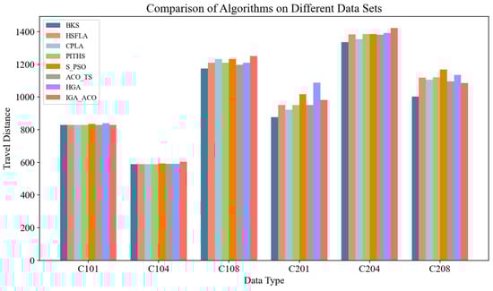 The effectiveness of the IGA-ACO algorithm was evaluated by comparing its results with those of state-of-the-art methods designed for the Vehicle Routing Problem with Time Windows (VRPTW). The methods included CPLA (Collaborative Particle Learning Algorithm by Barbucha), PITSH (Parallel Iterative Tabu Search Heuristic by Cordeau and Maisch Berger) [29], HSFLA (Novel Hybrid Shuffling Frog Leaping Algorithm by Luo et al.) [30], S-PSO (Discrete Particle Swarm Optimization by Gong et al.) [31], ACO-TS (Hybrid Ant Colony Optimization and Tabu Search method proposed by Yu) [32], and HGA (Hybrid Genetic Algorithm by Maroof et al.) [28]. The detailed experimental comparison results can be found in Table 5, with the corresponding visual comparison shown in Figure 11.