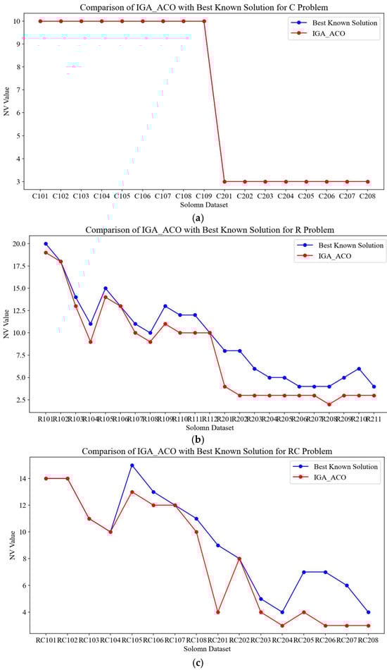 Comparison of Best Known Solution and IGA-ACO for Solomon Problem. (a) C Solution. (b) R Solution. (c) RC Solution.