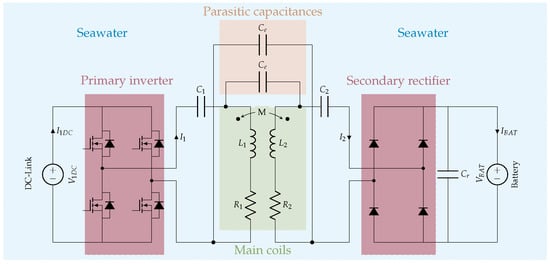 The proposed inductive wireless charger must operate in seawater, so the effects of this environment should be analysed to derive a precise electrical model. As mentioned in Section 1, working in seawater may require the inclusion of parasitic capacitances between the power coils [17]. These parasitic capacitances have a great impact on the resonance conditions.