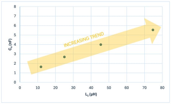 In Table 3, the results achieved during the simulation of the pair of coupled coils are shown. As can be seen, there is a relation between the value of the parasitic capacitance () and the size of the power coils ( and ). In order to better understand this relation, Figure 5 is included. As deduced from this figure, the parasitic capacitance has an increasing trend with respect to the self-inductance values, where it can be extrapolated that these two variables have a direct proportional relation. For this reason, the coil size should be optimised in order to reduce the value of the parasitic capacitance.