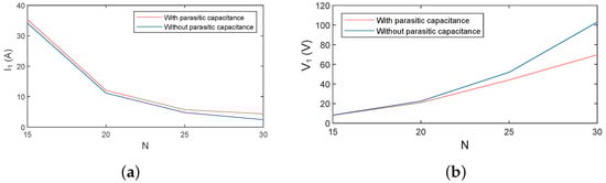 Significant values of parasitic capacitances have an impact on the electrical variables. As modelled in Equations (10) and (11), the primary voltage and current have a dependence on the value of the parasitic capacitance. Thus, it is interesting to analyse the electrical effects of the parasitic capacitances in the voltage and current for the proposed cases. In this way, a comparative analysis between the circuit considering the parasitic capacitance (associated with an application in seawater) and without considering it (with air-coupled coils) will be performed. Table 4 shows the final values for the voltage and current for the two configurations. As can be observed from Figure 6, the higher variations are found in cases of higher value of N, and, in general, the differences are not very relevant. However, in the case of N = 30, the voltage variation is 32.94 V, so it can be determined that this case will be neglected since the effects of parasitic capacitance cannot be avoided during the design.