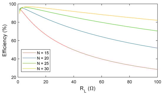 As can be observed in Figure 7, the efficiency values for N = 20 and N = 25 are similar in this range of load resistances. For this reason, the final selected topology is N = 20, as it derives lower voltage and current variations with a similar performance in terms of efficiency.