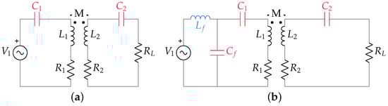 In this proposal, a comparison between SS and LCC–S will be developed. The reason for this selection is that both systems have good performance in terms of efficiency, as well as good behaviour under misalignment situations [24]. The structure of the mentioned topologies is represented in Figure 8. As can be observed, the main difference between these topologies is the inclusion of a filter block ( and ) on the primary side.