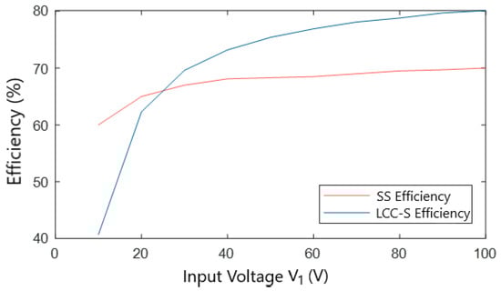 In order to select the optimal solution, a comparative analysis considering the system DC efficiency (12) is carried out. Figure 9 shows the comparison between the efficiency of the two types of compensation studied, and the difference between the two structures can be clearly seen.