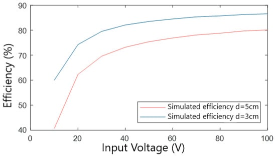 As can be observed from the previous results, the efficiency values in d = 3 cm are higher than in the case of d = 5 cm. In Figure 10, a comparison between both cases is represented. Since the efficiencies are higher for all the input voltage values, the selected configuration is d = 3 cm.