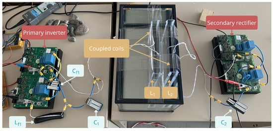 The compensation system capacitors (, , and ) have been constructed with polyester models through series-parallel combinations to finally achieve the final values calculated with Equations (17)–(19). The compensation inductor () has been constructed by using Litz wire, following a toroidal structure.