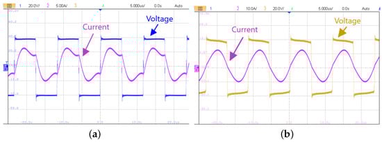 The experimental validation of this system consists of testing the prototype with a set of input voltage values (from 10 V to 100 V) to achieve 10 different output powers. For all the cases, the experimental waveforms or current and voltage have been measured on the primary and secondary sides, as shown in Figure 13.