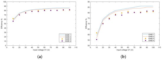 The comparative analysis of the efficiencies related to each case is represented in Figure 14. From this figure, it can be deduced that the variations between Case 2 with respect to Case 1 are similar to those between Case 4 with respect to Case 3. In this way, it can be found that the consideration of the parasitic capacitance leads to a weak reduction in the efficiency, both in simulation and experimental results. However, this reduction can be neglected since the efficiency values are reduced, in most cases, to less than 1%.
