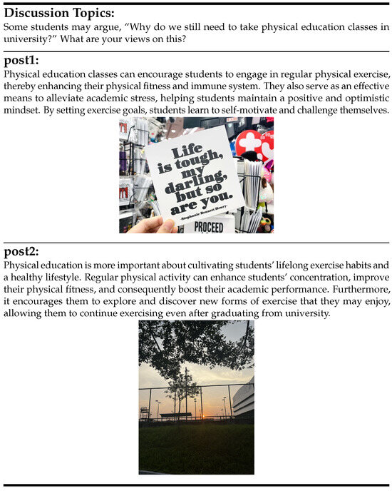 Multimode post examples under the topic “physical education classes”. Two posts utilizing multimodal data are presented under the same discussion topic. The text content of the two posts is similar, yet the image content differs, leading to vastly different evaluations of the posts’ quality.