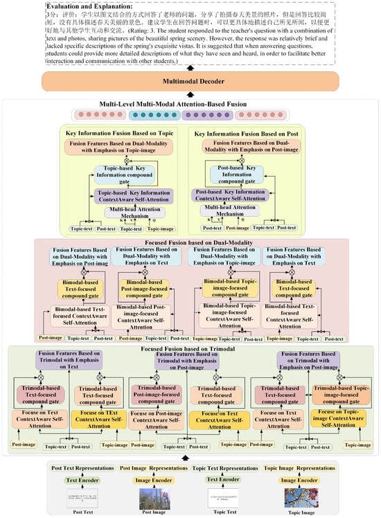 Due to the abundant data resources in discussion forums, many researchers have been attracted to study posts. Early research on posts usually required manual feature extraction, followed by the classification of posts using machine learning models [1]. In recent years, deep learning has gained favor among researchers for its ability to automatically extract features [2]. Nonetheless, these works have primarily relied on purely textual data. Using only unimodal data does not provide a comprehensive and accurate analysis of the relationship between posts and topics, which hinders the effective assessment of the quality of posts. As shown in Figure 1, a student responds to a topic question using a combination of text and images, with the text answering a part of the question and the images answering another part. Relying solely on textual data would not provide a comprehensive and accurate assessment of the post’s quality [3,4]. Utilizing multimodal data allows for a more comprehensive understanding of the post’s content, thereby enabling better evaluation of its quality. As illustrated in Figure 2, two different posts using multimodal data are presented under the same discussion topic. For the same question, the textual content of the two posts is similar, but they contain different image content, leading to vastly different evaluations of the posts’ quality. Therefore, each modality is crucial for assessing post quality. In most research on multimodal fusion, textual information is often treated as the primary modality, while other modalities are considered secondary, which dilutes the effective representation of other modalities’ information. Moreover, in multimodal fusion, the main features within the post and the topic as a whole are often ignored. Instead, only single-modality data from the post or the topic are fused with the input text, leading to the failure to capture key information and potentially yielding fusion results that are noisy or irrelevant. Furthermore, the fusion process often lacks the integration of modalities at different levels and scopes, which could provide a more comprehensive and thorough exploration of the relationships among multiple modalities. Based on these observations, we identify the following challenges in post quality evaluation methods: (1) Accurate and effective post quality evaluation should make full use of multimodal data to provide evaluations and relevant explanations. (2) In the process of multimodal fusion, attention should be given to the importance of each modality, rather than treating textual information as the primary modality. (3) Construct a multi-level multimodal fusion mechanism across diverse scopes to fully capture the relationship information among modalities at various levels and across multiple ranges, thereby facilitating the generation of accurate post quality evaluations and explanations.