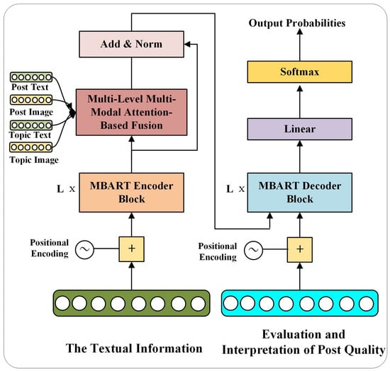 Flowchart of the MMFFPQ model structure. The model is based on the mBART architecture and uses a multi-level multimodal attention-based fusion mechanism to perform multimodal fusion of posts and topics across multiple ranges and levels, with attention given to each modality during the fusion process. It obtains comprehensive topic–post relationship information and facilitates the generation of post quality evaluations and explanations.