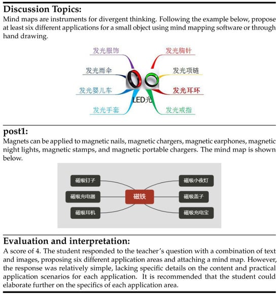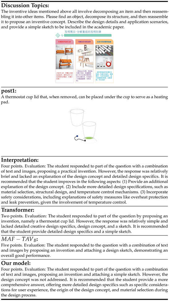 High-quality datasets for post evaluation and explanation are crucial for the development of the field, with potential applications extending to areas such as short-answer analysis in education. However, existing research only relies on simple text-based classification to evaluate posts, lacking corresponding explanations, which severely limits the guiding and promotional roles of evaluations. To address this, we constructed two multimodal post quality evaluation and interpretation datasets, sourced from the MOOC (Massive Open Online Courses) platforms of Chinese universities. In the data collection process, we used course categories as the main thread and traversed all courses within specific categories. For each course, we iterated through all relevant discussion topics under that course. Based on these discussion topics, we obtained topic–post pairs for each topic. This established a corresponding relationship among course category, course, topic, and post. To ensure the proportion of multimodal data in the multimodal dataset, we automatically analyzed whether each topic–post pair was composed of multimodal data during the crawling process. Pairs that contained only plain text data were directly excluded. Subsequently, we preprocessed the data. Firstly, we filtered out topic–post pairs that contained empty topics or post content. Then, we used a program to remove duplicate topic–post pairs to ensure the quality of the dataset. Additionally, we filtered out certain special characters from the text to standardize the formatting. Ultimately, we obtained data comprising 15,537 multimodal topic–post pairs, of which the Art and Literature dataset contains 3466 pairs and the Education and Teaching dataset contains 12,071 pairs. The evaluation section of the dataset encompasses quality scores, evaluation explanations, and suggestions. The quality scores are divided into five levels, with higher scores indicating a better fit between the post content and the topic. Initially, we utilized deep models and GPT4 to pre-label the quality scores, followed by manual proofreading. For the evaluation explanations and guidance, we first guided the GPT4 API to annotate the data using five specific examples. Then, we conducted a two-person manual proofreading process. Erroneous interpretations were directly revised manually. Specifically, in the process of annotating the evaluation explanations and guidance section, we employed multi-example prompt engineering to guide the GPT4 API in generating evaluation explanations and guidance that conformed to our requirements. We provided five specific examples corresponding to the five evaluation levels for a discussion topic. For the example at level 0, the post’s response deviated from the topic. For the example at level 1, the post partially addressed the topic, but the response was incomplete and stated in a simplistic manner. The example at level 2 provided a response that addressed part of the topic with more detail compared to level 1. For the example at level 3, the post addressed most of the discussion topic, but there were some deficiencies in language expression and logic. For the example at level 4, the post’s content addressed all aspects of the topic but lacked in completeness and clarity. For the example at level 5, the post comprehensively addressed all aspects of the topic, with clear expression and logic. Subsequently, the manual proofreading process was conducted in a progressive manner. The first annotator completed proofreading based on the results generated by GPT4. Then, the second annotator completed proofreading based on the results from both GPT4 and the first annotator. During this process, if there were discrepancies between the annotations of the two annotators, they would discuss and determine the final annotation result. This effectively ensured the accuracy and consistency of the annotations. Figure 5 presents a specific example from the dataset. In our experiments, we divided the dataset into training, validation, and test sets in a ratio of 8:1:1, with the specific division being shown in Table 1.