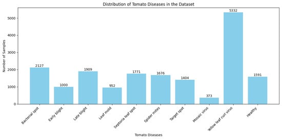 For training and validating our deep learning model, we selected ten categories of images, as shown in Figure 1. The dataset exhibited some level of class imbalance, with the ‘Yellow Leaf Curl Virus’ class having the highest representation (5332 images), while the ‘Mosaic Virus’ class had the lowest representation (373 images). This imbalance can impact model training and performance, as models may become biased toward the more prevalent classes.