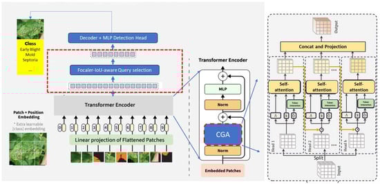 Furthermore, the model’s original loss function was optimized to the Focaler-CIoU loss function [29], adept at efficiently capturing edge information of tomato leaf diseases. Integrating the Focaler CIoU (Complete Intersection over Union) loss function into the Vision Transformer (ViT) architecture with cascaded group attention (CGA) enhances the model’s ability to handle difficult-to-detect classes by focusing more on hard examples and improving localization accuracy. The CIoU loss function is particularly beneficial for object detection tasks, as it considers both the intersection over union (IoU) of predicted and ground truth bounding boxes and the aspect ratio and distance between the center points of these boxes.