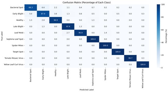 VGG16 is a convolutional neural network known for its simplicity and effectiveness in feature extraction [30]. It consists of 16 layers, including 13 convolutional layers and 3 fully connected layers. One of the key characteristics of VGG16 is its use of small 3 × 3 convolution filters, which allow the model to capture fine-grained details in images while maintaining a manageable number of parameters. The architecture’s uniform design facilitates hierarchical feature learning, making it particularly adept at recognizing complex patterns. VGG16 has demonstrated high accuracy in various image classification tasks, making it a reliable choice for detecting diseases in tomato leaves, where subtle visual cues can indicate specific health issues.